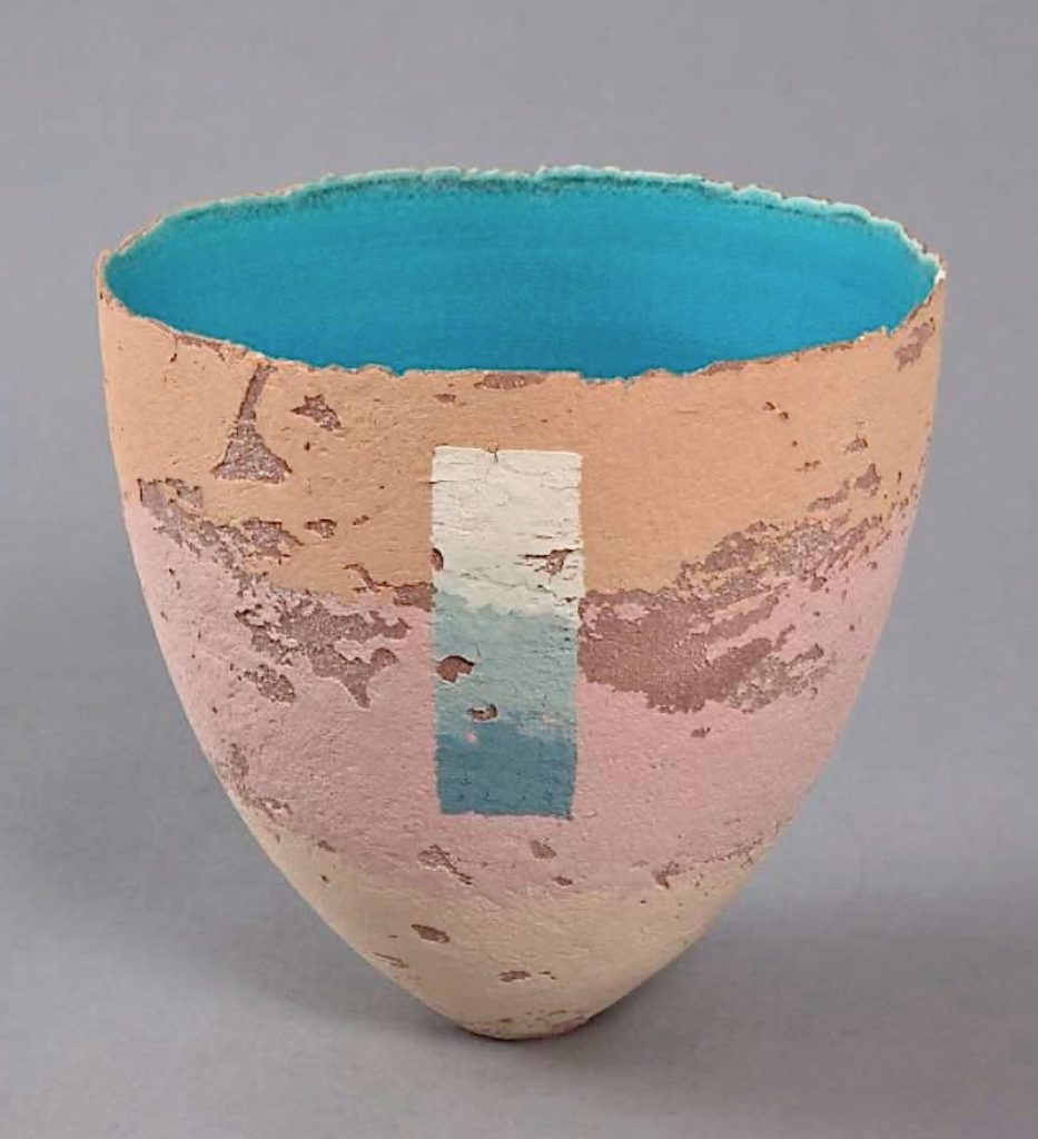 Every purchase is a huge boost, but a special one was in 1994, when Bristol Museum and Art Gallery bought a vessel, It is a design based on shutters against faded ochre peeling walls in the south of France. It was special to have something bought for their permanent collection, especially as I had been a very frequent visitor for the years while studying for the ceramics degree there, and had gained much inspiration – initially for the college projects, and later for my own work.
