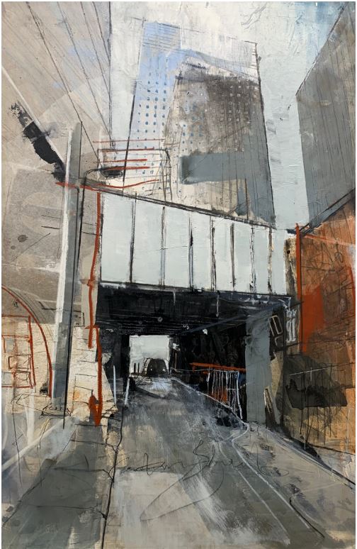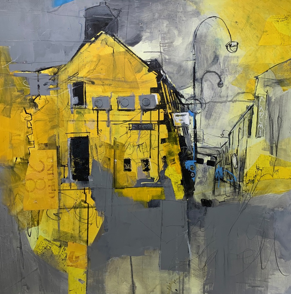 The use of a single primary colour in this painting is very simply to challenge myself. I don’t generally use many primaries, certainly not yellow and yet this building, in a local town centre caught my eye. It’s bright yellow stained walls and plethora of signage and exterior air-conditioning units and drainpipes gave it an industrial, urban and shabby feel that I particularly enjoy. I wanted to use yellow to sing out almost like a Basquiat painting.