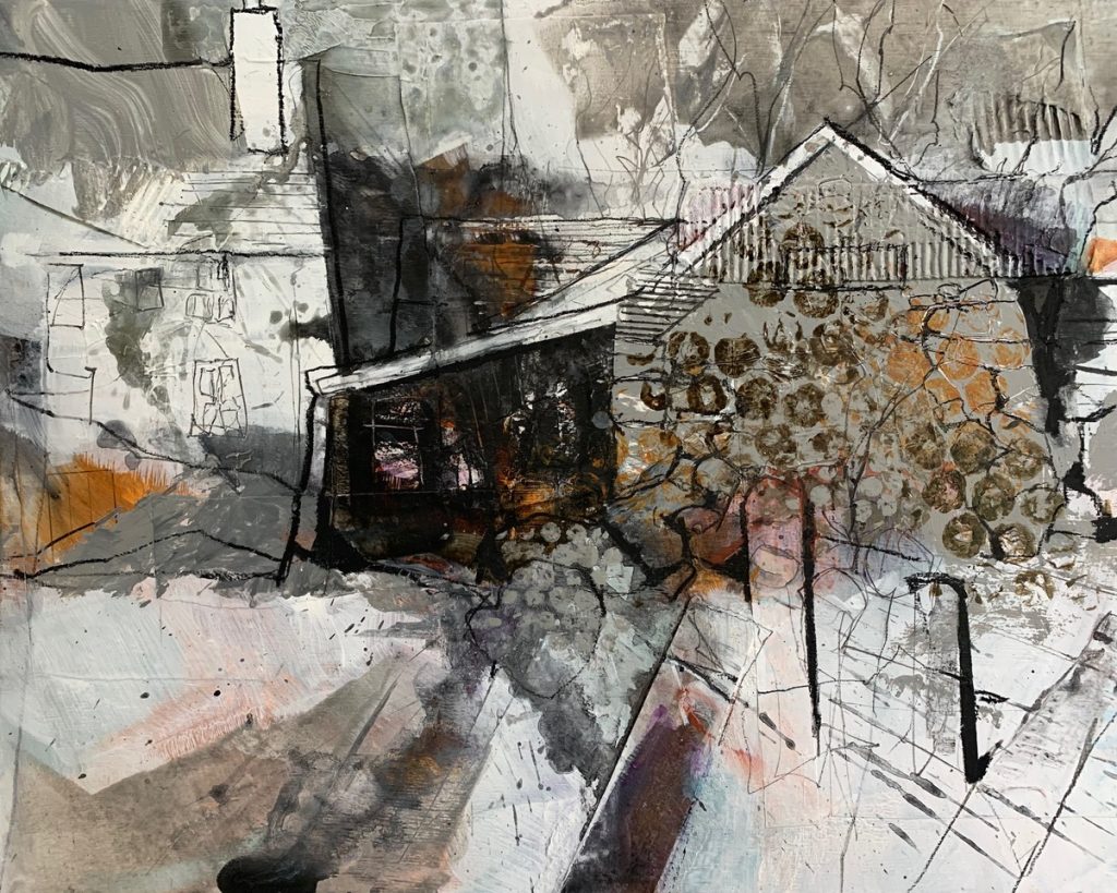 I have a very small studio space (9 square metres) but I can shut the door to be alone if needed. Other artists and printmakers are often around and the impromptu meetings in the kitchen over a cup of coffee are mostly profound and stimulating. As mentioned I’m not sure there is a classic but certainly there are elements that I love and re-use time and again. Such as corrugated cardboard and old maps for collage. A welsh barn would be typical subject matter, I love the way they snuggle into the landscape and show evidence of hard graft over generations. I want to capture that in the work. There are also colours that could be regarded as favourites; ultramarine blue and burnt Sienna, van gogh brown, green-gold, transparent raw Sienna, transparent red iron-oxide, all from Golden or Liquitex.